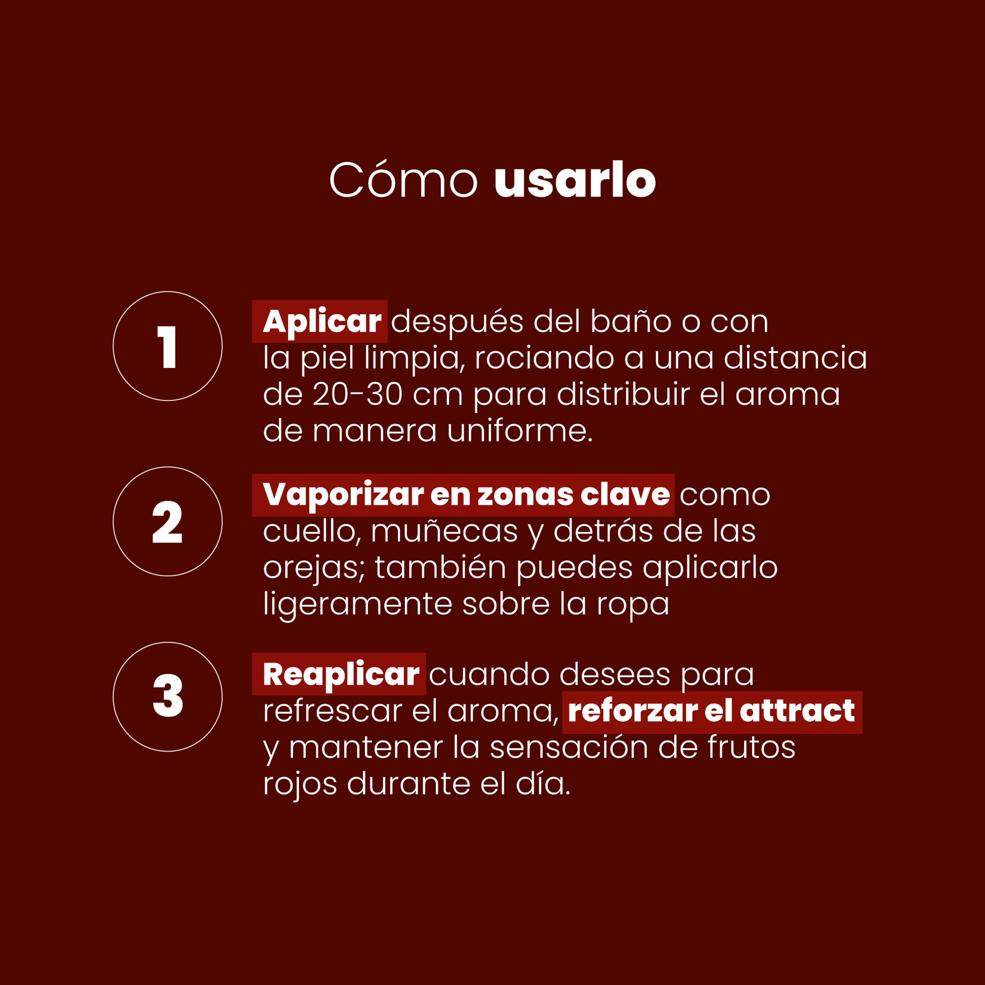 Presione y aplique por todo el cuerpo, accionando el spray por unos segundos. Haga énfasis especial en el cuello, muñecas y detrás de las orejas para una mejor fijación.
